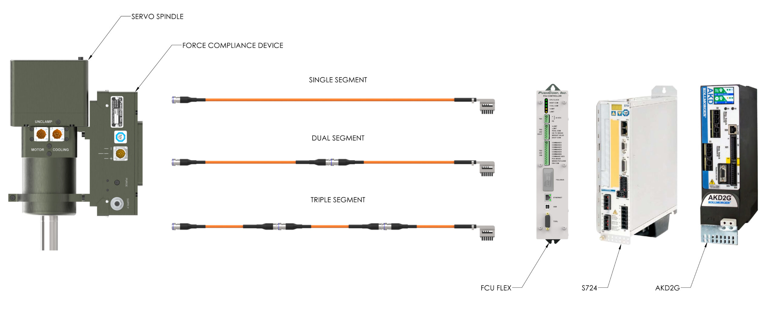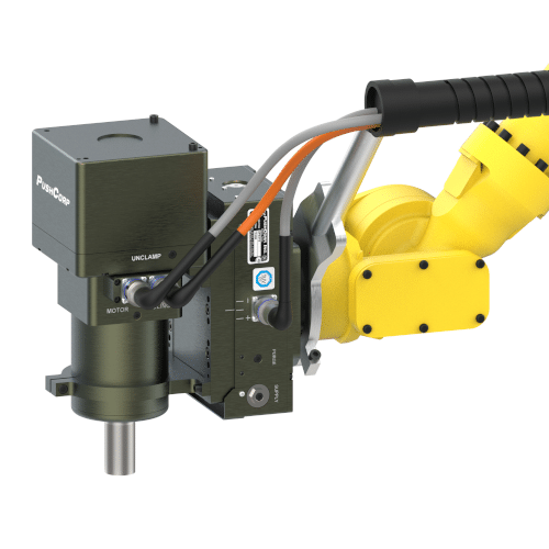 If your set-up requires a tighter or more compact solution, cables can be ordered with a 90 degree connector on the tool end. This orients the cables toward the motor and force compliance housings. This is beneficial for processes that need to fit in tight locations or cables that are at a higher risk of being snagged by the part. Since the cables have 90 degree connectors, you must specify the clocking for each. The following section will go into detail on this process.