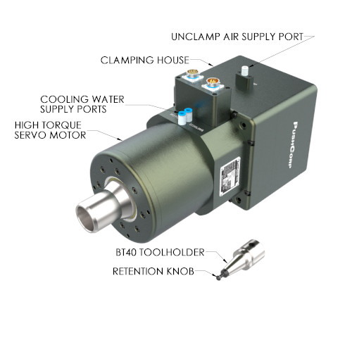 The motor shaft is configured to accept standard BT40 tapered toolholders. Customers can choose to use standard, off-the-shelf CNC tooling as well as custom PushCorp toolholders. Together, these components allow for a wide range of abrasive disks, wheels, drill bits, and cutting tools.